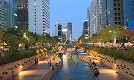Cheonggyecheon is a 10.9-kilometre-long (6.8 mi), modern public recreation space in downtown Seoul, South Korea. The massive urban renewal project is on the site of a stream that flowed before the rapid post-war economic development caused it to be covered by transportation infrastructure.