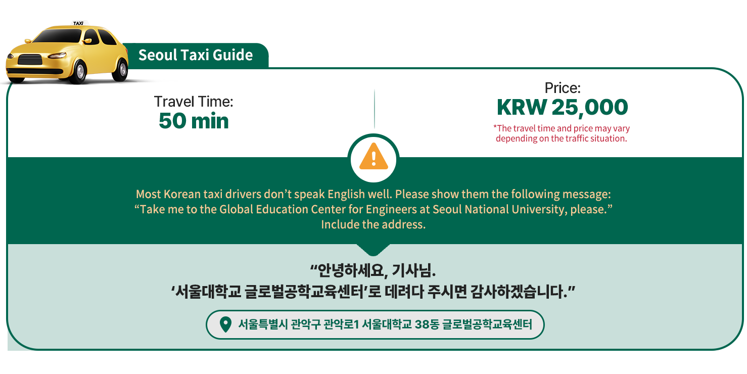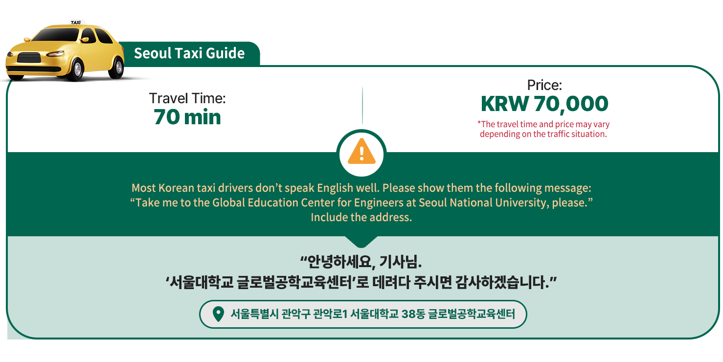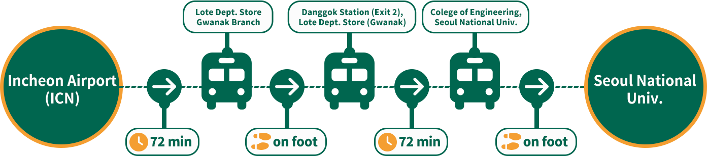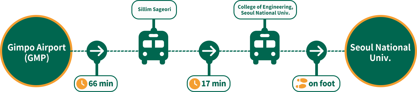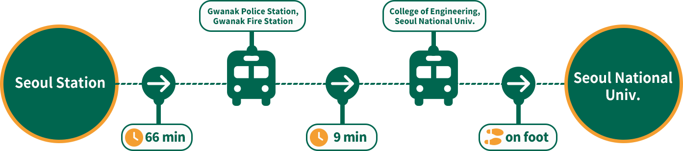 It takes approx. 115 minutes to Seoul National Univ. (The travel time may vary, depending on the traffic situation.)
